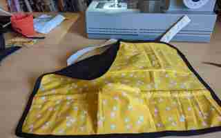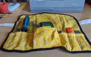 I made a tool roll from scaps. The outside is from that old jacket (“the gift that keeps on giving”) that I also used for the outside of my laptop bag. The inside is made of scraps from some table cloth I made for my mother. The binding cord has been a handle of a shopping bag I turned into a bag with a draw string. It has just enough room for a few essential items I tend to have lying around in a drawer.